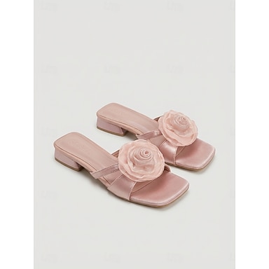 Sandalias de tacón de bloque de satén rosa para mujer, zapatos de vestir sin cordones con apliques florales y punta cuadrada para fiestas en el jardín o bodas. &eventos al aire libre