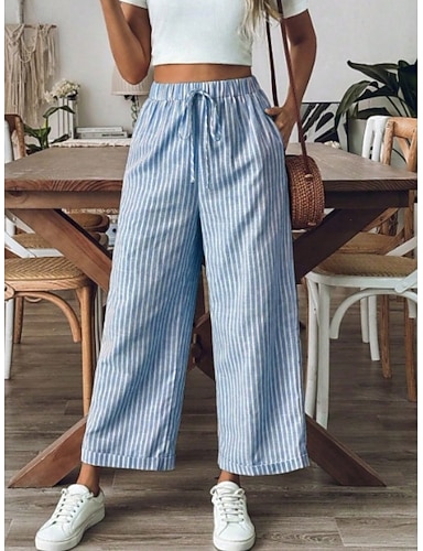 Mujer Lino de algodón sintético Perneras anchas Pantalones Pantalones casuales Vacaciones Moda Ropa de calle Hasta el Tobillo Alta cintura A Rayas Bolsillo Cintura elástica A Rayas Comodidad Cómodo