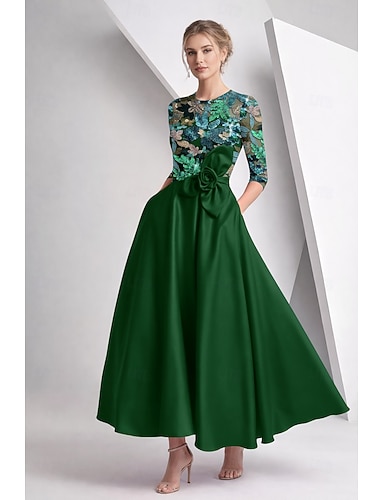 Corte A Hasta el Suelo Vestido Midi Bordado con cuentas Vestido formal Vestido de madre de la novia Vestidos de coctel Vestidos de noche Vestidos de fiesta Elegante Sedoso Manga 3/4 Cuello Barco Boda