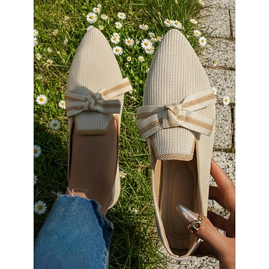 Mocasines de mujer de punto beige con punta puntiaguda y lazo: elegantes zapatos planos transpirables sin cordones para negocios, brunch y viajes.