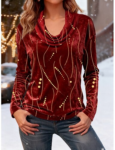 Mujer Sayo Tee Estampado A Capas Graphic Geometría Elegante Vintage Moda Manga Larga Cuello vuelto holgado Tops regulares Diario Noche Fin de semana Vino Azul Real Morado Dorado Verde Trébol Otoño