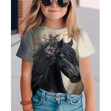 Chica 3D Graphic Caballo Camiseta Manga Corta Verano Primavera Moda Básico Niños 4-12 años Cuello Barco Casual Diario Exterior Ajuste regular