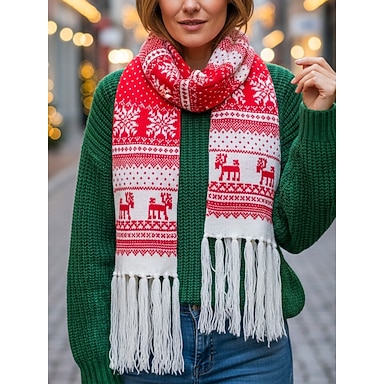 Bufanda navideña de punto para mujer, de acrílico, con estampado Fair Isle rojo y blanco con renos y copos de nieve, accesorio festivo de invierno para fiestas navideñas.