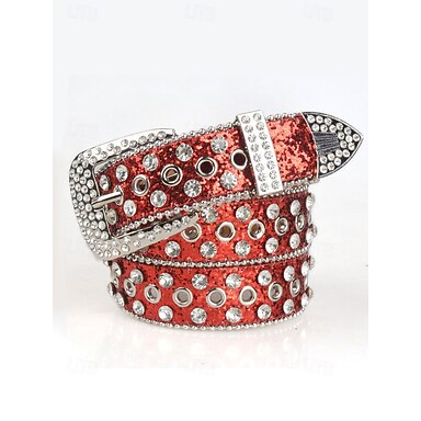 Cinturón navideño brillante para mujer: piel sintética con tachuelas de cristal y hebilla plateada, diseño festivo en rojo, perfecto para atuendos festivos.