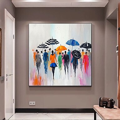 Pintura abstracta pintada a mano de caminantes con paraguas, óleo sobre lienzo, obra de arte para decoración del hogar, lluvia en memoria, pintura sobre lienzo, arte de pared
