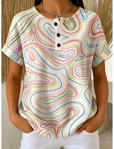 Camiseta de punto texturizado tipo gofre para mujer, con estampado degradado, geometría gráfica, elegante, clásica, manga corta, cuello redondo, estilo Henley, tops regulares, para uso diario,