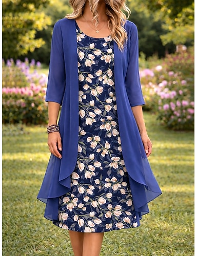 Mujer Conjunto de vestido Vestido de una línea Elegante Vacaciones Floral Graphic Multi capa Estampado Mini vestido Media Manga Cuello Barco Diario Azul Oscuro Verano Primavera Ajuste regular