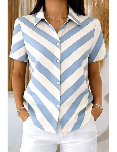 Camisa de señora de manga corta Gráfico de rayas Vintage Tropical Elegante Cuello regular Tops diarios Azul Negro Rosa Marrón Verde Verano Primavera