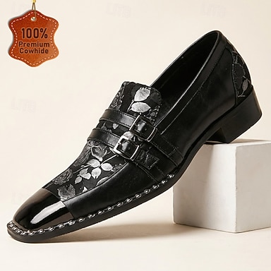 Mocasines negros para hombre con bordado floral, hebilla metálica y cierre sin cordones. Zapatos de vestir de lujo para invitados a bodas, banquetes, fiestas, graduaciones y eventos de noche.