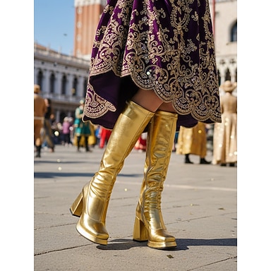 Botas metálicas plateadas hasta la rodilla para mujeres de Mardi Gras con tacón de bloque - Estilo de plataforma retro de los años 70 para carnaval fiestas y eventos de disfraces