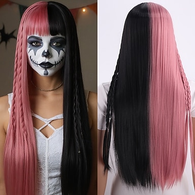 Peluca larga y lisa rosa y negra para mujer: gorro completo, peluca de modelo realista, perfecta para cosplay de Halloween, moda y uso diario.