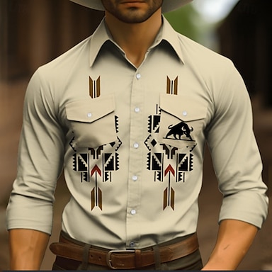 Hombre Tribal Estampados Cosecha Camisa camisa occidental Camisa vaquera Manga Larga Moda Ropa de calle Design Exterior Diario Otoño invierno Cuello Vuelto Estampado Azul Piscina Caqui