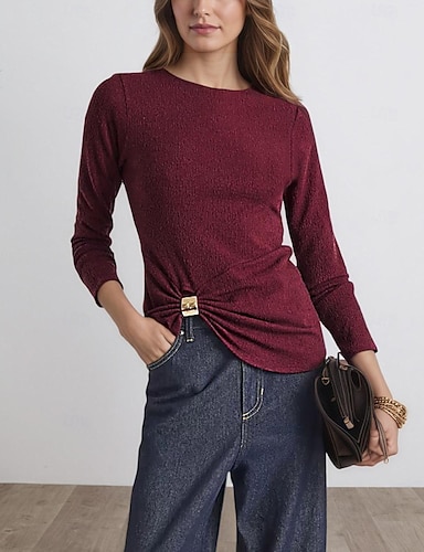 Mujer Difuso Frunce Hebilla metálica Color sólido Moda Casual Manga Larga Cuello Barco Escote Redondo Tops regulares Diario Noche Vino Primavera Otoño