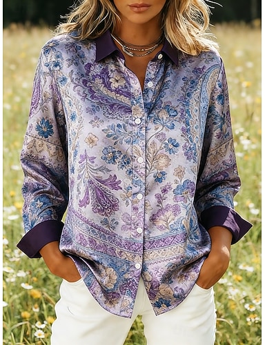 Mujer Camisa Estampado Floral Graphic Bohemia Vintage Clásico Manga Larga Cuello Camisero Tops regulares Diario Festivos Noche Morado Verano Primavera Otoño