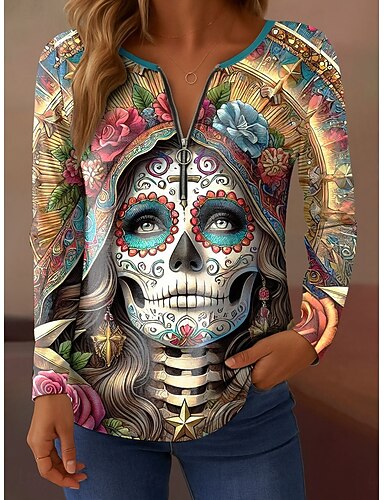 Camiseta de mujer gráfica calavera moda casual de manga larga cuello en crew cuello redondo tops regulares para el día a día impresión con zipper en negro primavera otoño invierno