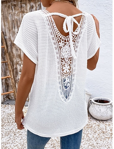 Mujer Camiseta Camiseta superior Encaje Retazos Espalda al Aire Plano Moda Elegante Clásico Manga Corta Escote en Pico Tops regulares Diario Noche Fin de semana Blanco Verano Primavera