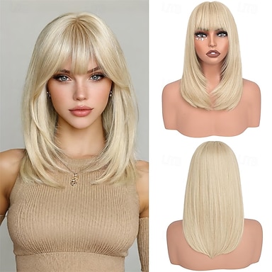 Pelucas rubias bob con flequillo, hasta los hombros, lisas, de aspecto natural, sintéticas, resistentes al calor, de longitud media, para mujer, ideales para fiestas y uso diario. Rubio platino de 40