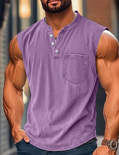 Hombre Camiseta sin mangas Top Camisetas Interiores Camisa 100% algodón con lavado ácido Sin Mangas Henley Verano Plano Moda Design Básico Bolsillo Botones Casual Vacaciones Calle Azul Piscina Negro