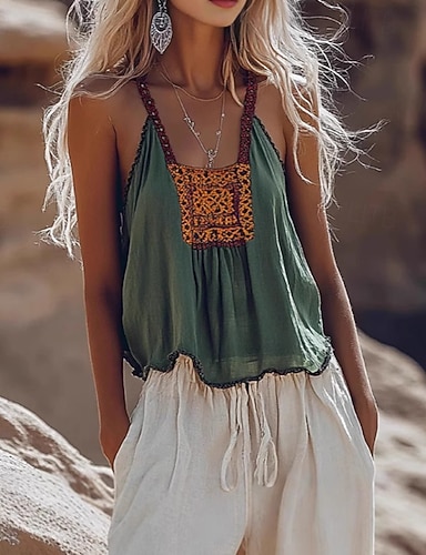 Mujer camisa boho Blusa Estampado Flor Moderno Casual Boho Sin Mangas Escote en Pico Tops regulares Festivos Noche Verde Trébol Verano