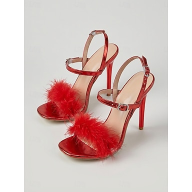 Sandalias de tacón alto con plumas rojas para mujer: tacones de aguja sexys con tiras para discotecas y fiestas. &noche glamurosa