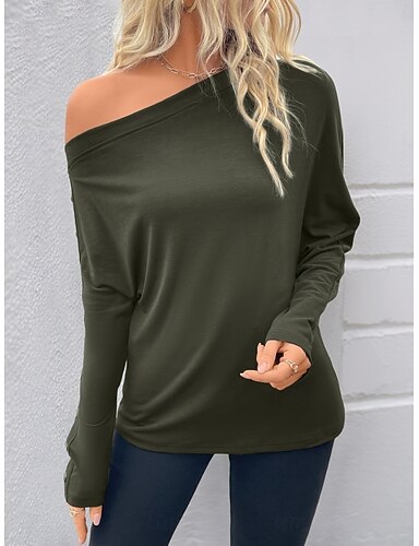 Mujer Camiseta Camiseta superior Plano Moda Elegante Clásico Manga Larga Cuello asimétrico Tops regulares Diario Noche Fin de semana Verde Trébol Verano Primavera Otoño