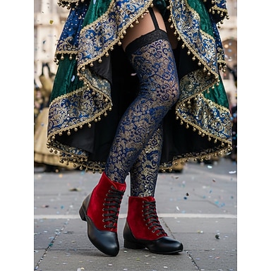 Botas de carnaval de terciopelo rojo y negro para mujer: botines victorianos vintage con cordones para la mascarada de Venecia; elegantes zapatos de festival para desfiles callejeros.