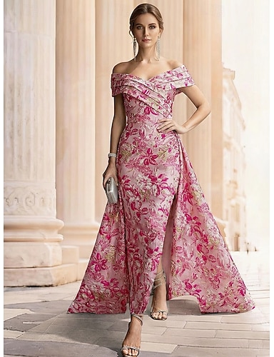 Corte A Hasta el Suelo Vestidos de noche Vestido de baile con sobrefalda Vestimenta formal Elegante Estilo de Celebridad Sedoso Sin Mangas Hombros Caídos Fiesta de jardin Boda Jacquard con Plisado
