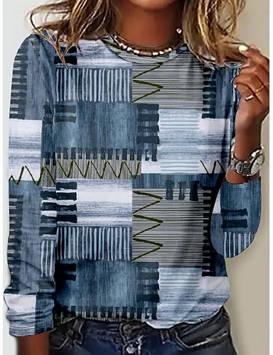 Camiseta de mujer de cuello redondo manga larga túnica gráfica moderna casual tops regulares impresión diaria fin de semana azul otoño invierno