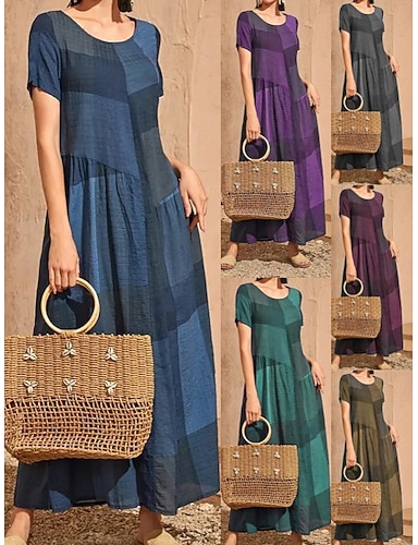 Mujer Vestido maxi Lino de algodón sintético Vestido bohemio Vestido informal Vintage Moda Moderno Exterior Vacaciones Noche Ajuste regular Geométrico Manga Corta Cuello Barco Azul Piscina Rojo