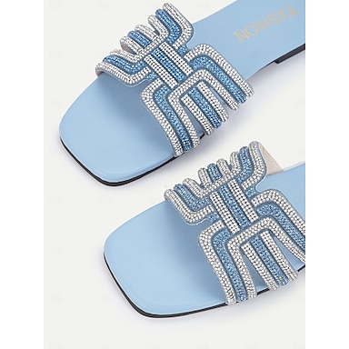 Sandalias con adornos de diamantes de imitación de color azul claro para mujer: zapatos elegantes y cómodos sin cordones para el verano, la playa y las salidas informales