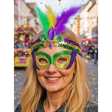 Juego de máscara y banda para la cabeza de lentejuelas de poliéster para mujeres de Mardi Gras - Colores vibrantes con plumas perfecto para el carnaval y fiestas de disfraces