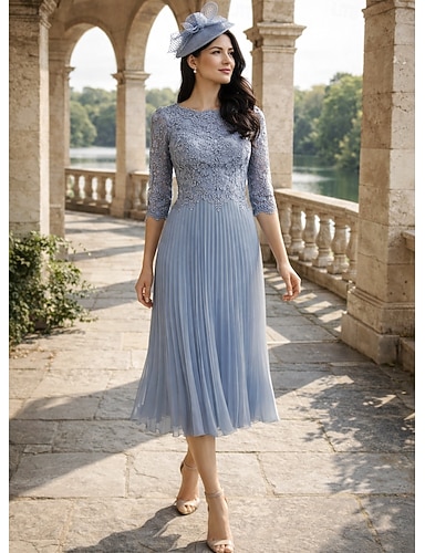 Corte A Vestido Midi Bordado con cuentas Vestido formal Vestido de madre de la novia Vestidos de coctel Vestidos de fiesta Elegante Manga 3/4 Cuello Barco Fiesta de jardin Boda Satén Encaje con