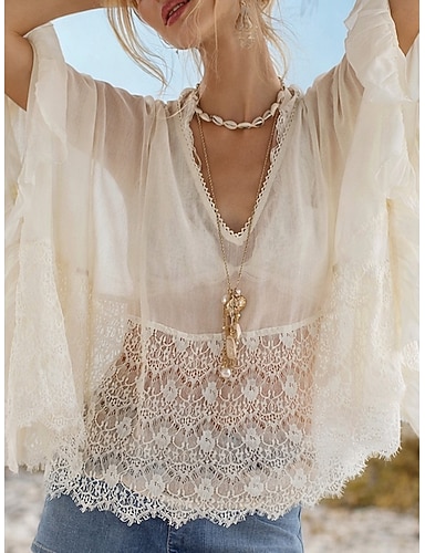 Mujer Blusa Encaje Color sólido Elegante Casual Manga 3/4 Escote en Pico Tops regulares Diario Blanco Verano Primavera Otoño