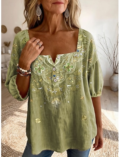 Mujer Camisa Lino de algodón sintético Estampado Abstracto Diario Casual Manga 3/4 Cuello Barco Tops regulares Diario Festivos Azul Piscina Blanco Verde Trébol Verano Primavera Otoño