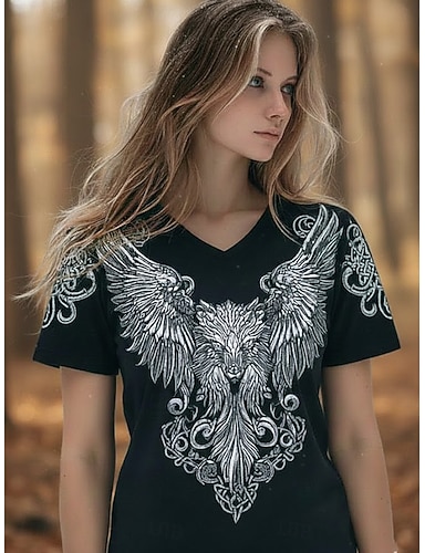 Camiseta Boho VIKING para mujeres Gráfica Bohemia Vintage Casual Manga Corta Cuello en V Tops Regulares Diarios Impresión Negra Verano Primavera