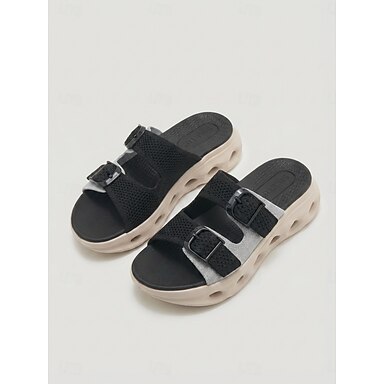 Sandalias negras de doble hebilla para mujer: sandalias deportivas transpirables de punto con soporte para el arco del pie, cómodas y fáciles de poner para el verano y los viajes. &ropa de uso diario