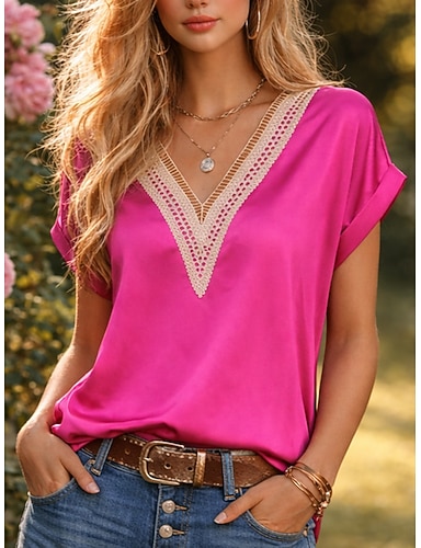 Mujer Camiseta Camiseta superior Encaje Color sólido Moda Clásico Casual Manga Corta Escote en Pico Tops regulares Diario Noche Fin de semana Negro Blanco Rosa Azul cielo Verde Trébol Verano Primavera