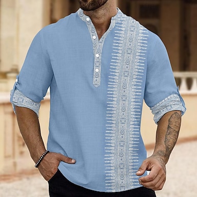 Hombre Tribal Étnico Impresión de pañuelo Camisa Camisa de lino Abotonar la camisa Manga Larga Tribal Vacaciones Ropa Cotidiana Noche Primavera & Otoño Escote Chino Botones Estampado Azul Piscina