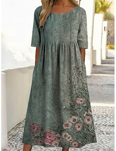 Mujer Vestido Midi Vestido informal Vestido Estampado Vintage Exterior Vacaciones Noche Holgado Floral Graphic Media Manga Cuello Barco Azul Piscina Amarillo Morado Verde Trébol Verano Primavera