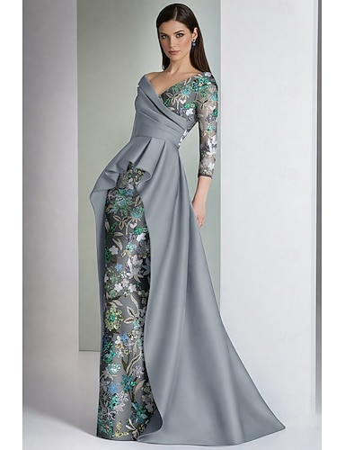 Funda Columna Hasta el Suelo Bordado con cuentas Vestido formal Vestido de madre de la novia Vestidos de noche Vestido de baile con sobrefalda Vestimenta formal Elegante Vintage Reluciente Manga 3/4