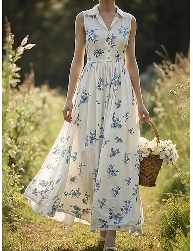 Mujer Vestido maxi Vestido informal Vestido de raso Vestido de una línea Vestido de flores Elegante Moda Moderno Exterior Vacaciones Noche Ajuste regular Floral Sin Mangas Cuello Camisero Azul Piscina