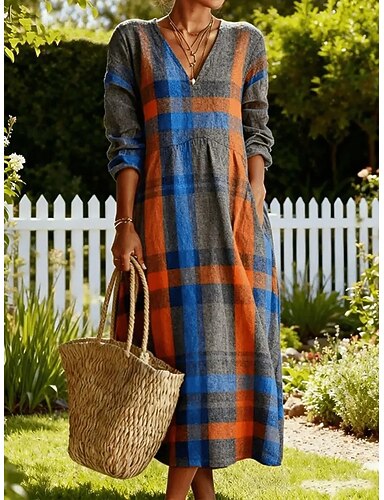 Mujer Vestido maxi Vestido de Camisa Vestido informal Moda Básico Moderno Diario Exterior Playa Ajuste regular Plaid Manga 3/4 Escote en Pico Naranja Verano Primavera