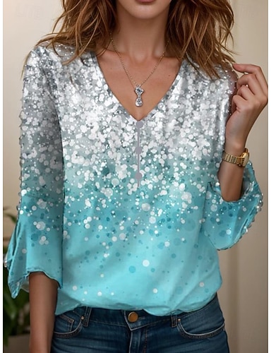 Mujer Camiseta Estampado Ombre Graphic Pato Vintage Elegante Clásico Manga Larga Escote en Pico Tops regulares Diario Azul Piscina Morado Verde Trébol Gris Primavera Otoño Invierno