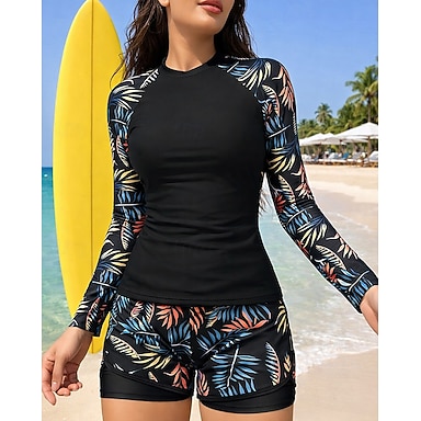 Mujer Camiseta Protección Solar Surf Traje de baño 2 Piezas Tropical Boyleg Protección UV Elástico Manga Larga Bañadores Traje de baño Surf Playa Natación Verano