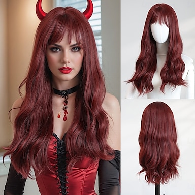 Peluca ondulada color burdeos de 20 pulgadas para mujer: flequillo completo, cabello largo, ideal para Halloween, cosplay y estilos de moda actuales.