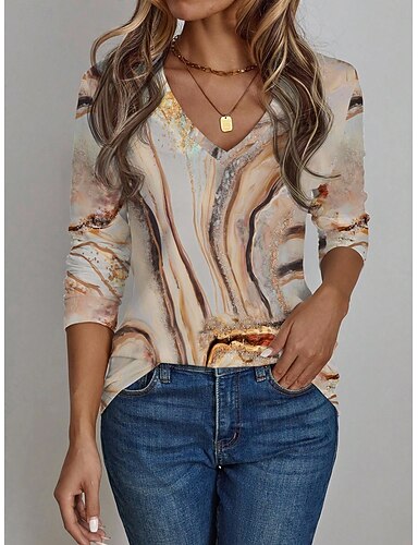 Mujer Camiseta Estampado Ombre Graphic Vintage Elegante Casual Manga Larga Escote en Pico Tops regulares Diario Marrón Primavera Otoño Invierno