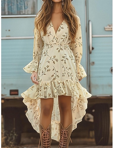 Mujer Mini vestido Vestido informal Vestido de raso Vestido de flores Elegante Moda Moderno Exterior Vacaciones Noche Ajuste regular Floral Manga Larga Escote en Pico Amarillo Verano Primavera