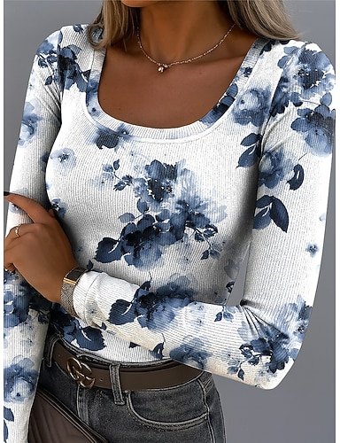 Camiseta para mujer de manga larga con gráfico de cuello cuadrado túnica de manga larga casual floral plantas vintage estilosa top regular wear diario estampado en negro blanco amarillo verde claro