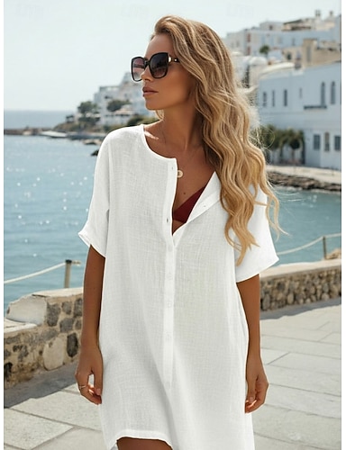 Mujer Camisa Blusa Lino de algodón sintético Botones Plano Activo Elegante Manga Corta Cuello Barco Tops regulares Diario Festivos Noche Blanco Amarillo Rosa Brillante Verano Primavera