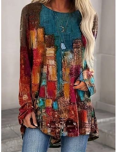 Mujer Camiseta Estampado Graphic Geométrico Vintage Elegante Clásico Manga Larga Cuello Barco Escote Redondo Tops largos Diario Rojo Morado Primavera Otoño